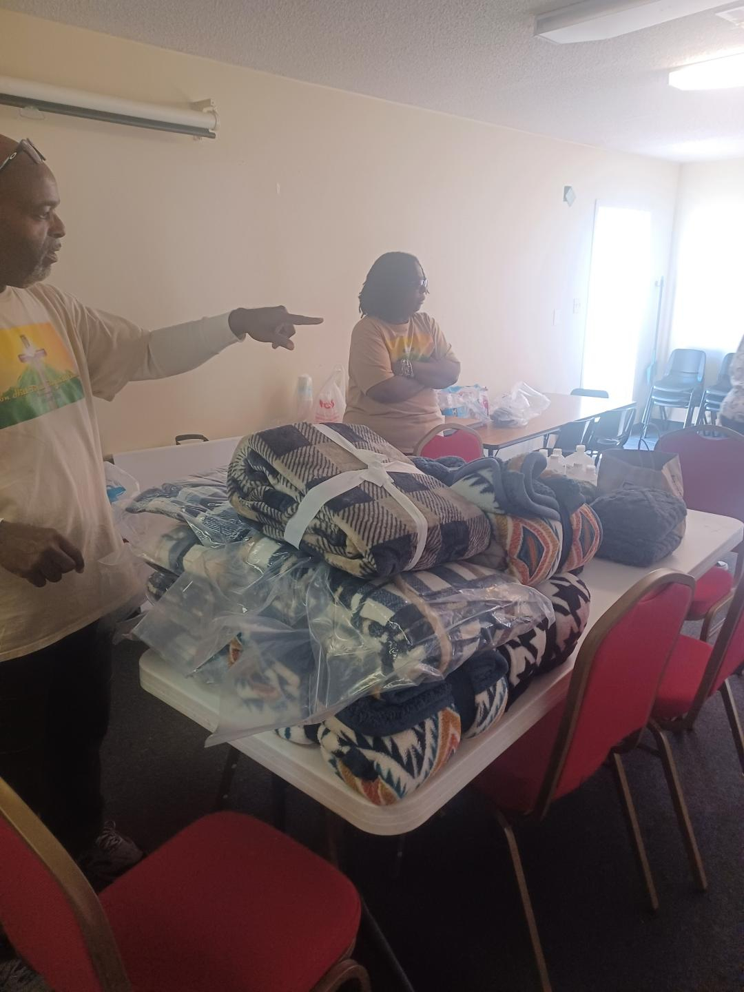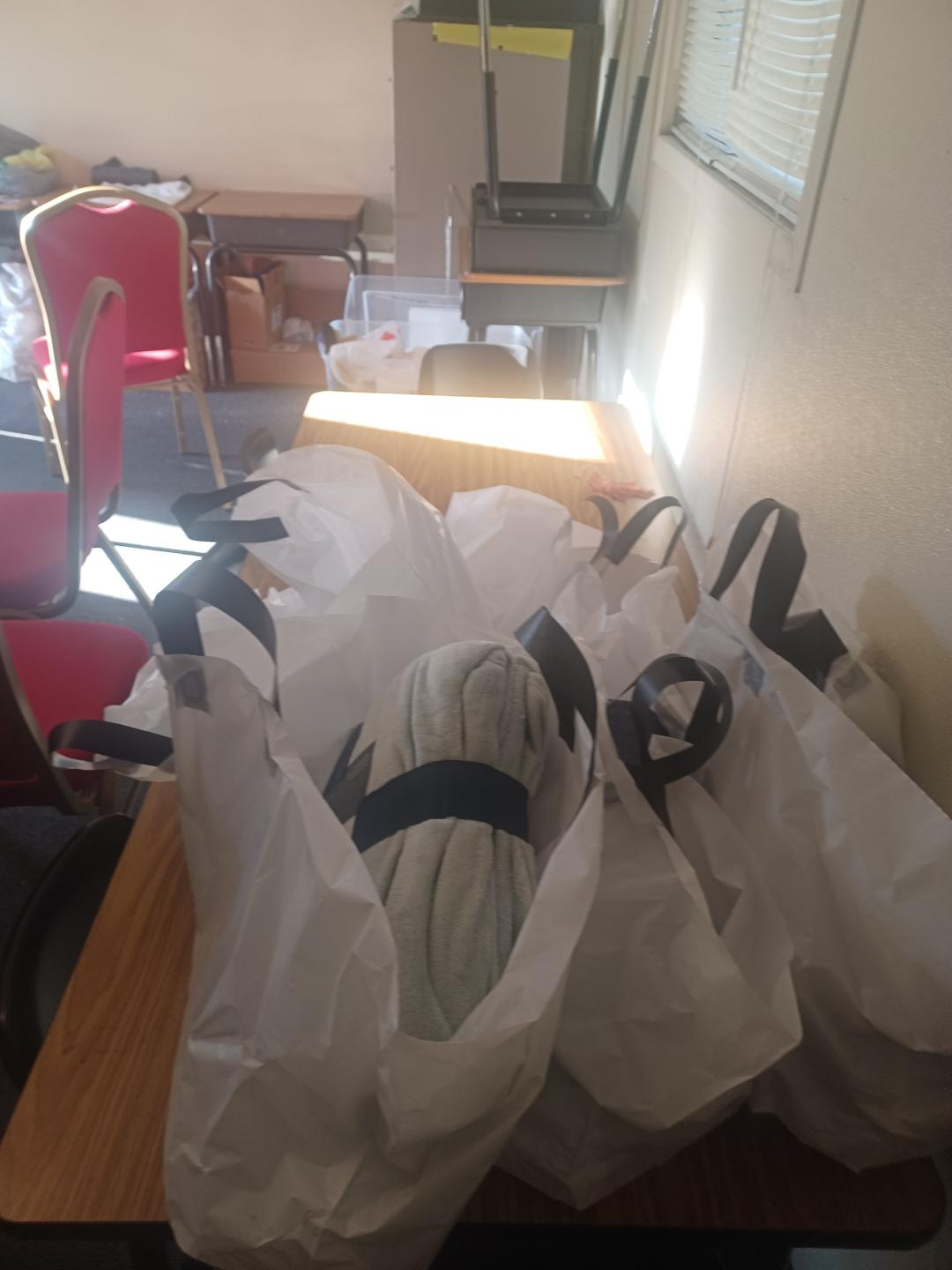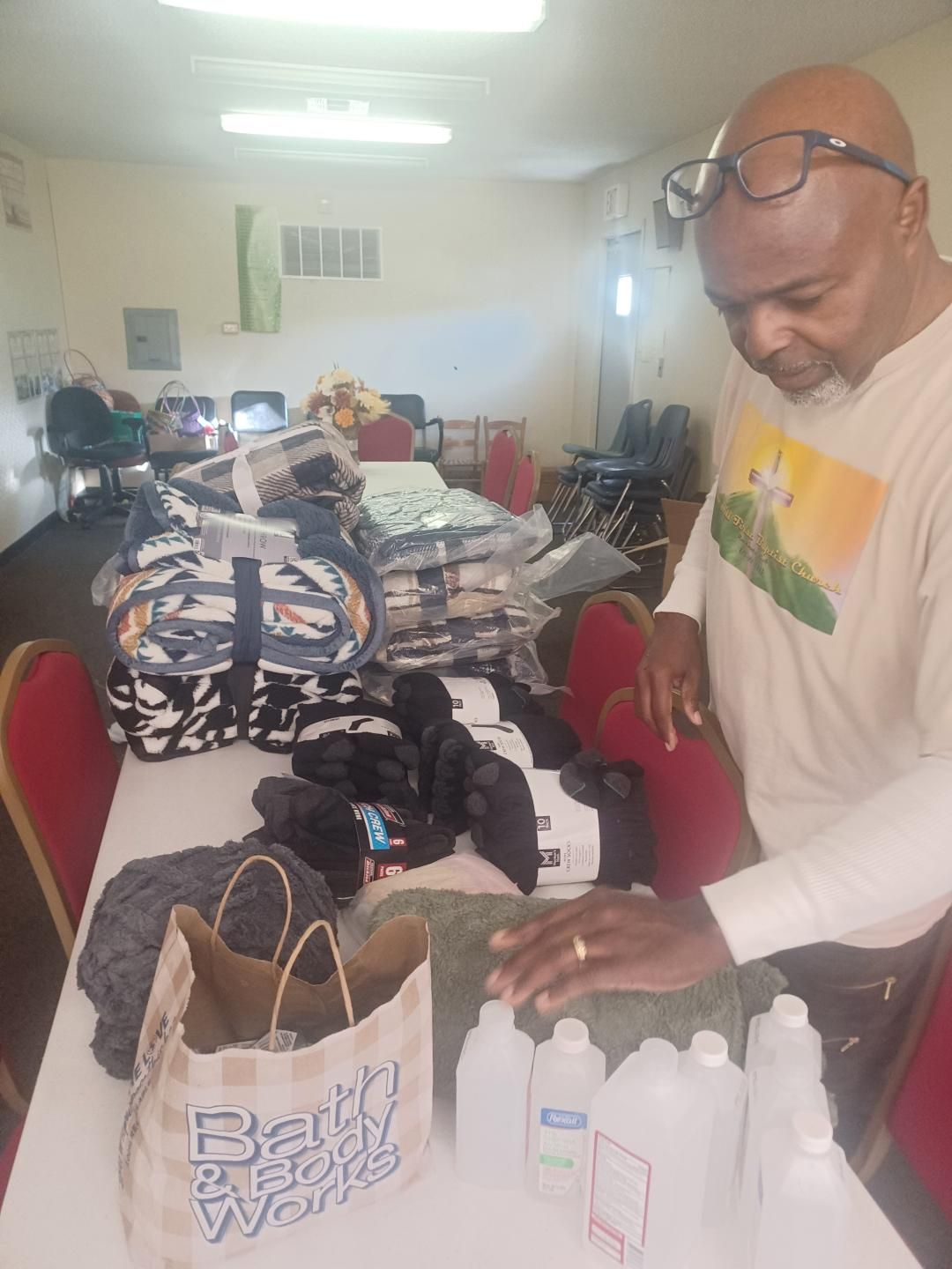 Preparing personal items, blankets, socks, rubbing alcohol, etc., for people experiencing homelessness